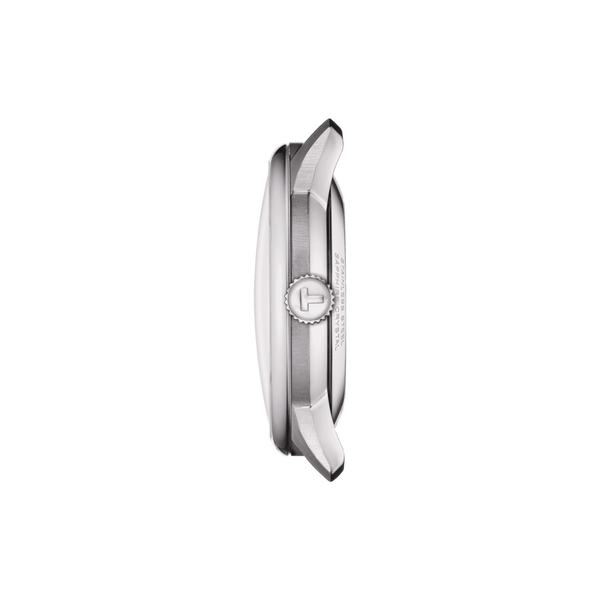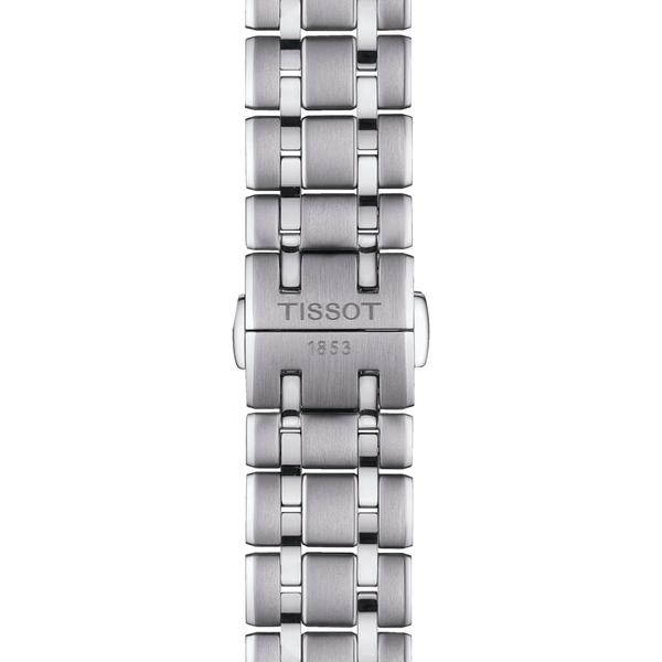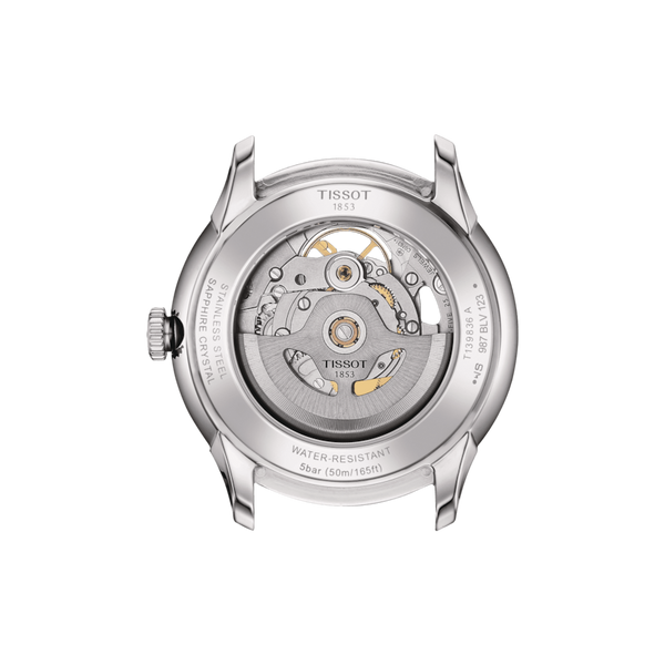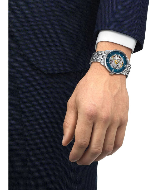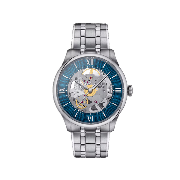 Gent's Tissot Chemin Des Tourelles Skeleton Automatic Watch. The 39mm case and bracelet are stainless steel. The watch features a skeleton inner dial with a blue outer flange dial with silver coloured roman numerals and indexes. The watch has a domed sapphire crystal glass and a see-through case back revealing the movement. The movement is automatic with a Nivochron balance spring. Currently out of stock.