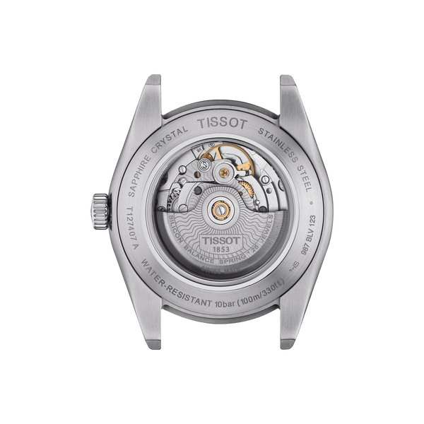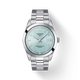 Tissot Gentleman Powermatic 80 Silicium Watch. The 40mm case and bracelet are stainless steel. The dial is ice blue with a date function. The glass is a domed sapphire crystal. The watch has a see-through case back and is 100m water resistant. The movement is a Powermatic 80 Automatic with a silicon balance spring.