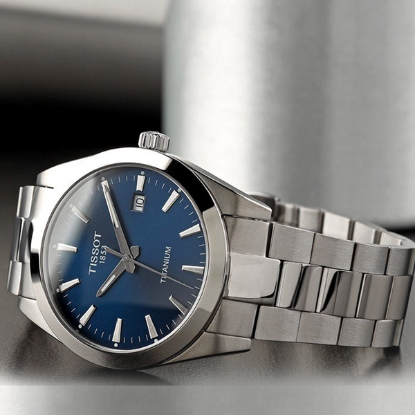Tissot Gentleman Titanium 40mm Case and Bracelet Strap Blue Dial Sapphire Crystal Glass Date 100m Water Resistant Quartz Watch.