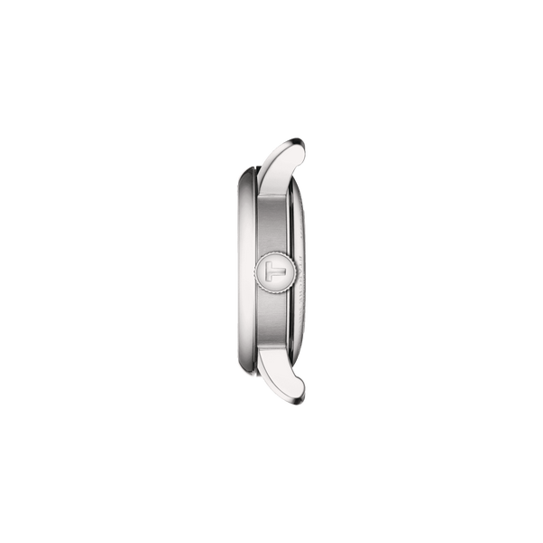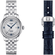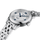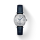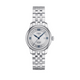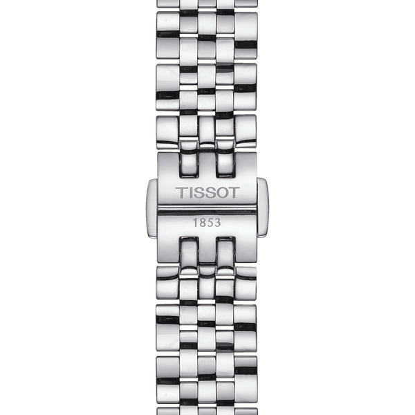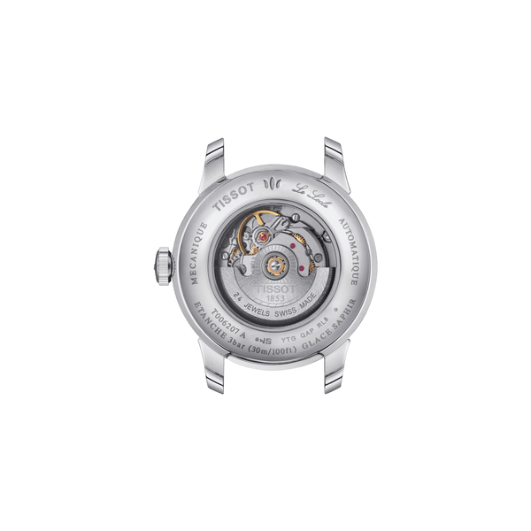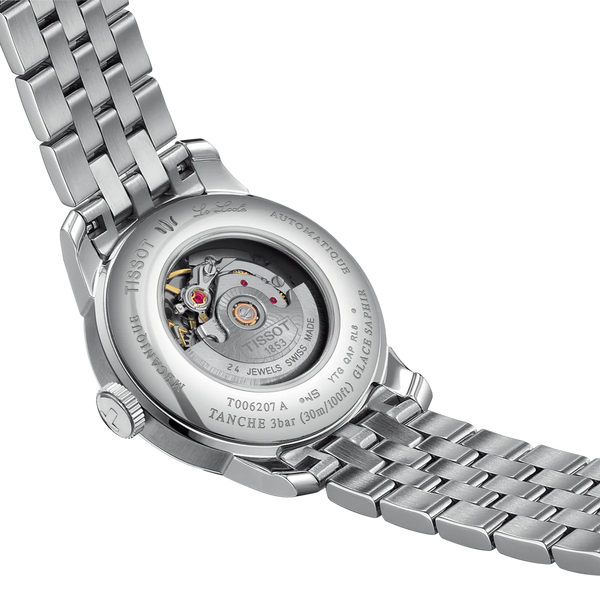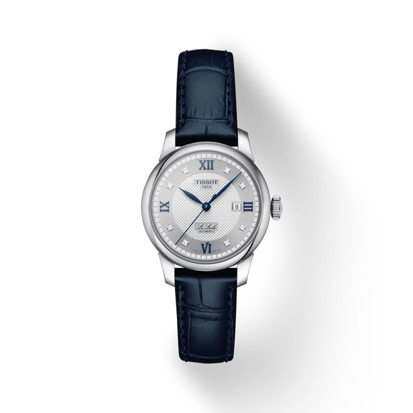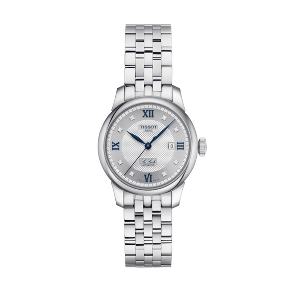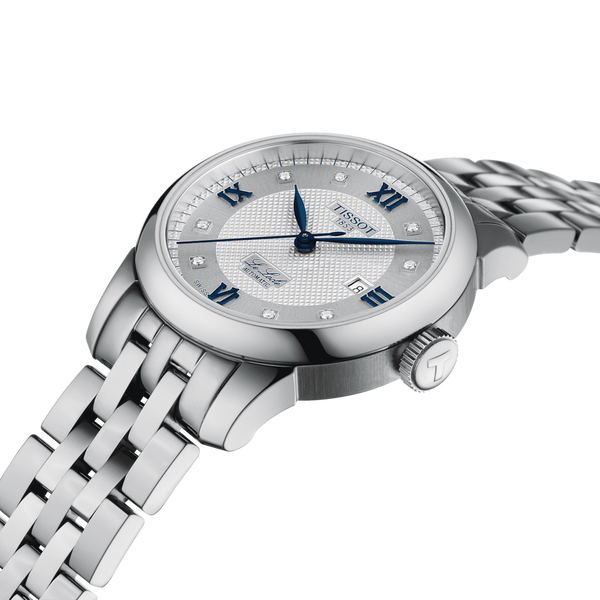 Ladies Tissot Le Locle 20th Anniversay Automatic Watch. The 29mm case and bracelet are stainless steel. The dial is silver with 8 diamond set hour markers, blue roman numerals and a date function. The glass is sapphire crystal and the watch has a see-through case back. Presented with an addtional dark blue leather strap with a deployment clasp. 20th Anniversary Model of the Le Locle Collection.