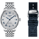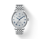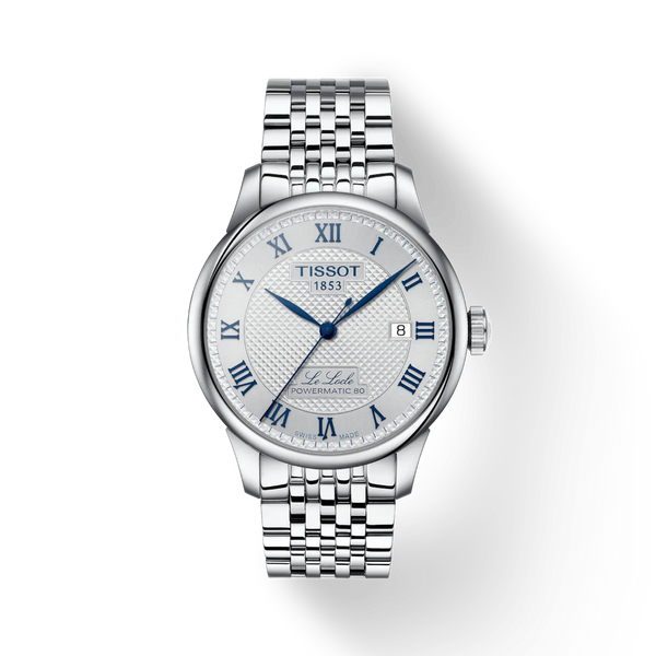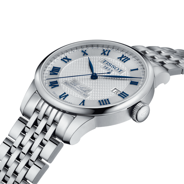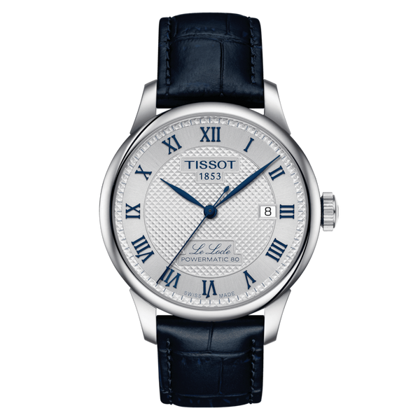 Gent's Tissot Le Locle Anniversary 20 Powermatic 80 Watch. The 39mm case and bracelet strap are stainless steel. The dial is silver and the glass is sapphire crystal. The hands and roman numerals are blue in colour. The dial features a date function at 3 o'clock. The watch comes with a blue leather strap and stainless steel deployment clasp with quick release function.