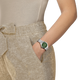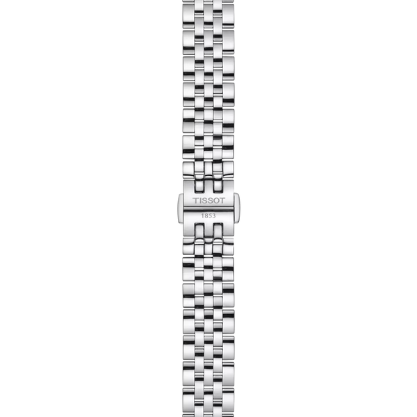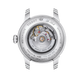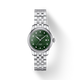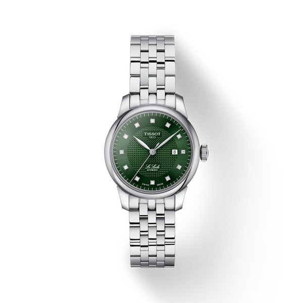 Ladies Tissot Le Locle Automatic Watch. The 29mm case and bracelet are stainless steel. The dial is green with twelve diamond set hour markers and a date function. The watch has a sapphire crystal glass and a see-through case back. The movement is automatic.