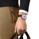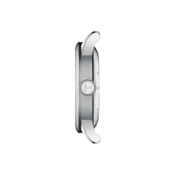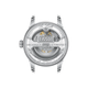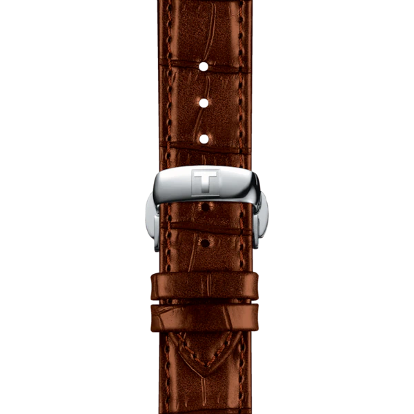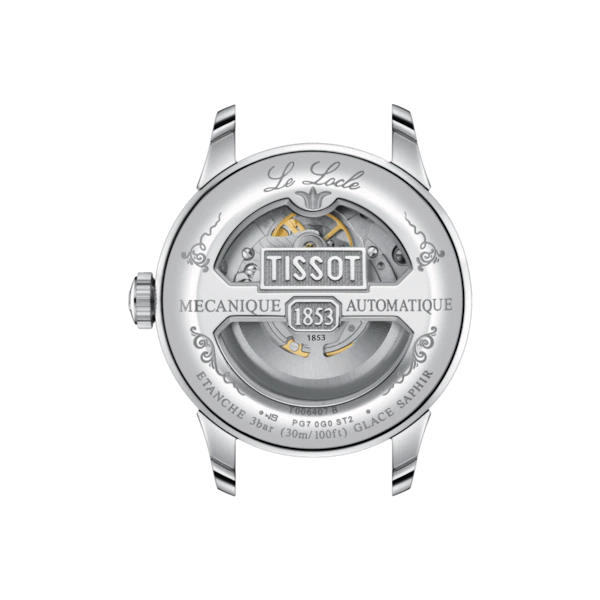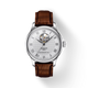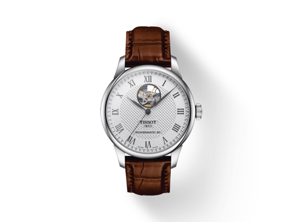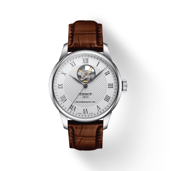 Gent's Tissot Le Locle Open Heart Powermatic 80 Watch. The 39mm case is stainless steel. The strap is brown leather with a deployment clasp. The dial is silver with a circular shaped window revealing the movement. The glass is sapphire crystal and the watch has a see-through case back. The movement is a Powermatic 80.