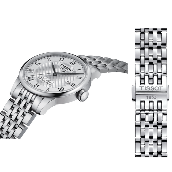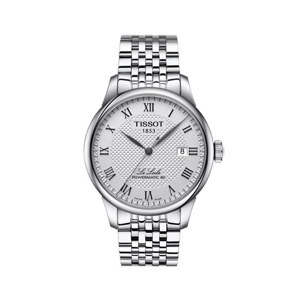 Tissot Le Locle Powermatic 80 Watch. The case and bracelet strap are stainless steel. The dial is silver in colour and the glass is sapphire crystal. The dial features a date function at 3 o'clock.