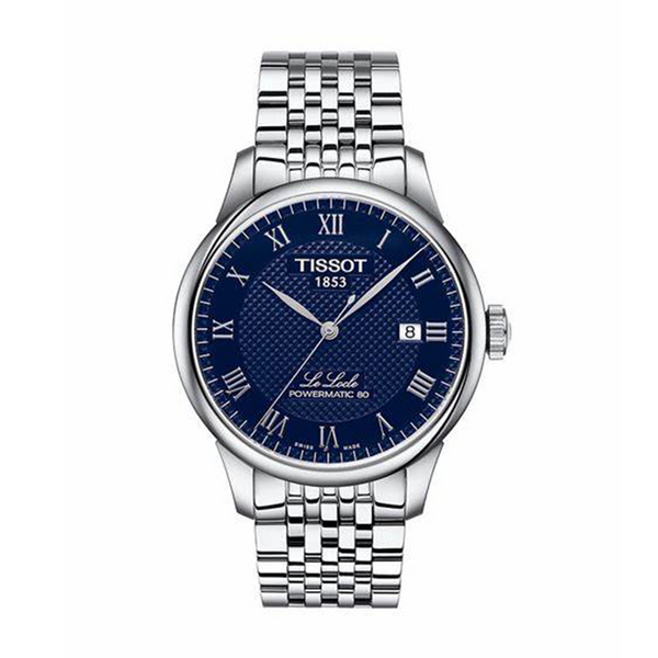 Gent's Tissot Le Locle Powermatic 80 Watch. The 39mm case and bracelet strap are stainless steel. The dial is blue and the glass is sapphire crystal. The dial features a date function at 3 o'clock.