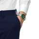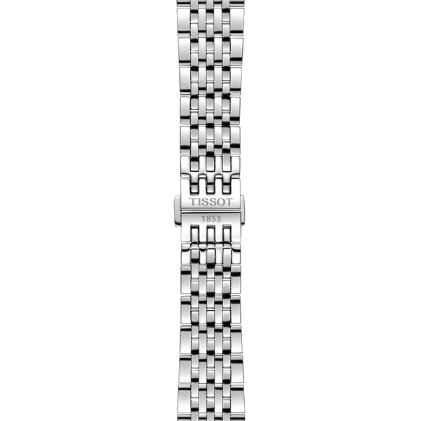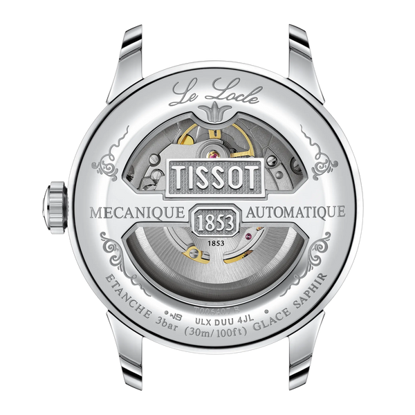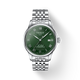 Gent's Tissot Le Locle Powermatic 80 Watch. The 39.3mm case and bracelet are stainless steel. The dial is green with roman numeral indexes and a date function at 3 o'clock. The glass is sapphire crystal and the watch has a see-through case back. The movement is an automatic Powermatic 80.