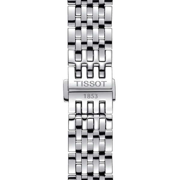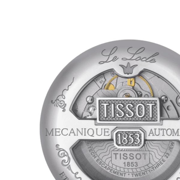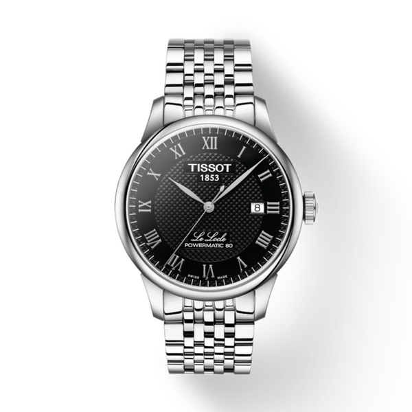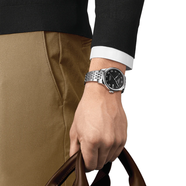 Gent's Tissot Le Locle Powermatic 80 Watch. The 39mm case and bracelet are stainless steel, the dial is black and the glass is sapphire crystal. The watch features a date function at 3 o'clock and a see-through sapphire crystal case back. The movement is Powermatic 80.