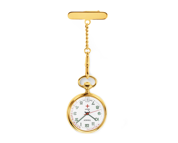 Tissot Nurses Fob Watch Gold PVD on Stainless Steel with Cream Coloured Dial Red Second Hand and Green Numbers Quartz Movement.