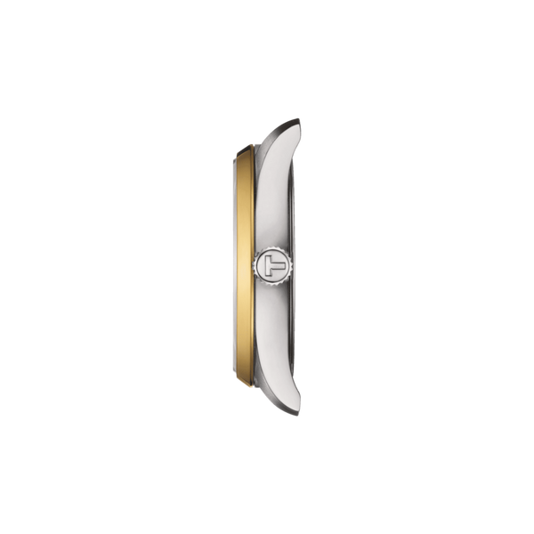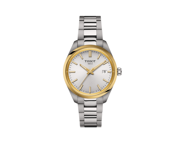 Ladies Tissot PR100 Bicolour Stainless Steel 34mm Case and Bracelet with Yellow Gold PVD on Stainless Steel Polished Bezel Silver Dial Sapphire Crystal Glass Date 100m Water Resistant Quartz Watch. Currently out of stock.