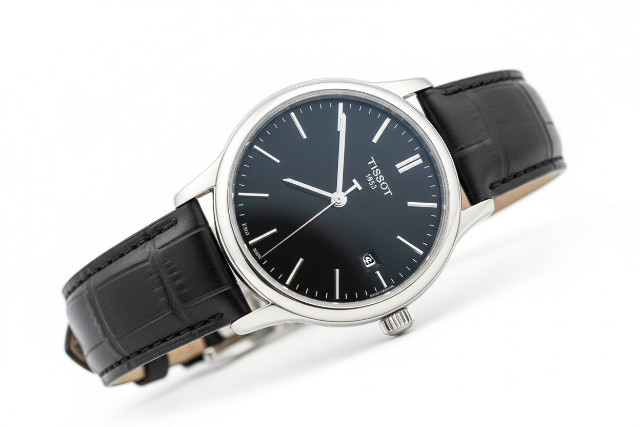 Gent's Tissot PR100 Stainless Steel 40mm Case with Black Leather Strap Black Dial Sapphire Crystal Glass Date 100m Water Resistant Quartz Watch.