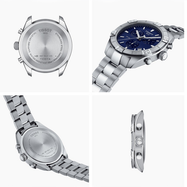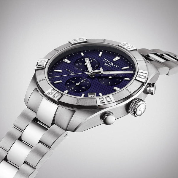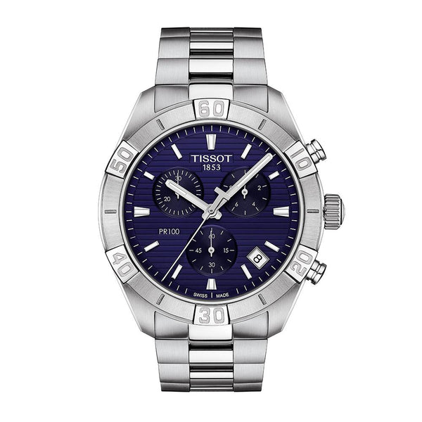 Gent's Tissot PR100 44mm Stainless Steel Case and Bracelet Blue Dial Sapphire Crystal Quartz Chronograph Watch. Currently out of stock but available to order.