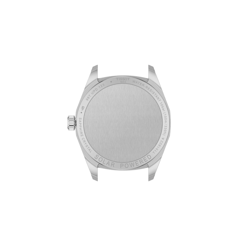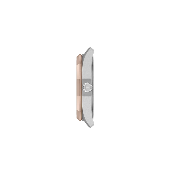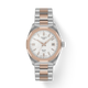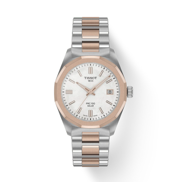 Tissot PRC 100 Solar Bicolour: Rose Gold PVD and Stainless Steel 34mm Case and Bracelet Rose Gold PVD Dodecagonal Bezel White Mother-of-Pearl Dial Sapphire Crystal Glass Date 100m Water Resistant Solar Powered Quartz Watch.