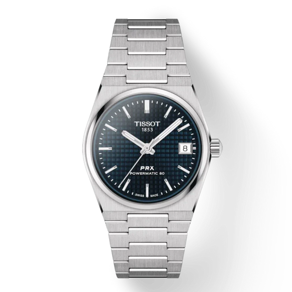 Tissot PRX Powermatic 80 Watch. The 35mm case and bracelet strap are stainless steel, the dial is blue and the glass is sapphire crystal. The watch has a see-through case back and date function. The movement is a Powermatic 80 automatic and has a Nivachron Balance Spring. The watch is 100 metres water resistant. Currently out of stock.