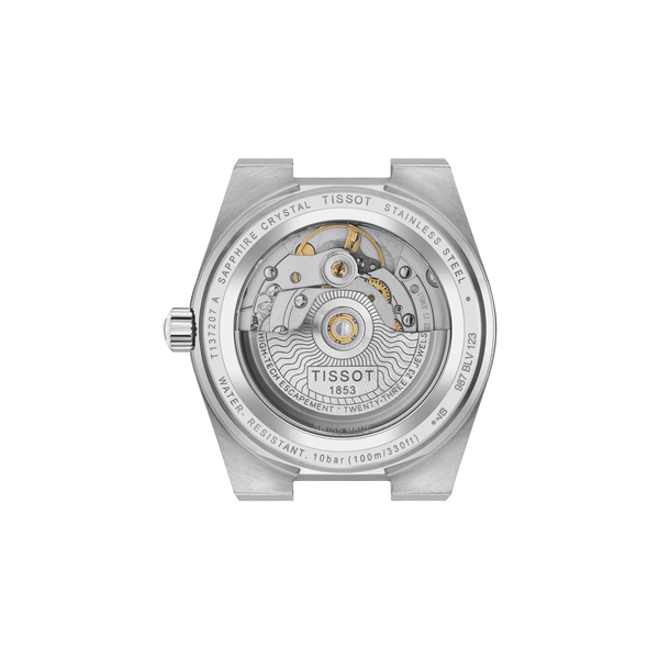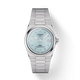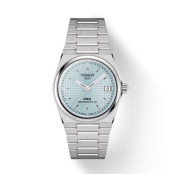 Tissot PRX Powermatic 80 Watch. The 35mm case and bracelet are stainless steel. The dial is ice blue with a date function. The glass is sapphire crystal. The watch has a see-through case back and is 100 metres water resistant. The movement is a Powermatic 80 Automatic with a Nivachron Balance Spring. Currently out of stock.