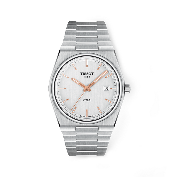 Gent's Tissot PRX Stainless Steel 40mm Case and Bracelet White Dial with Rose Coloured Hands and Indices Sapphire Crystal Glass Date 100m Water Resistant Quartz Watch. Currently out of stock.