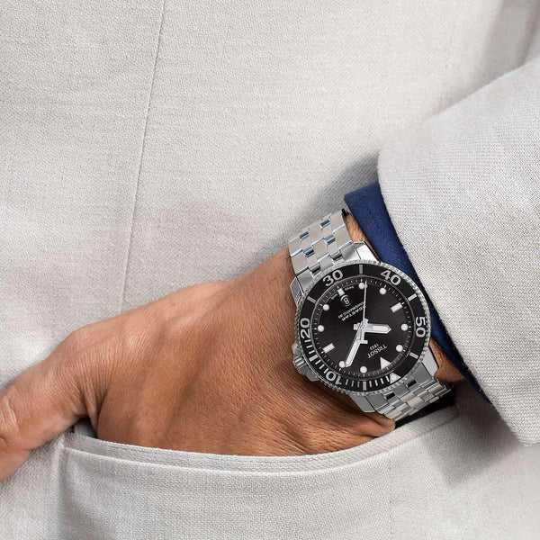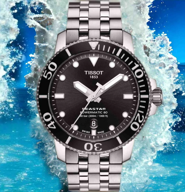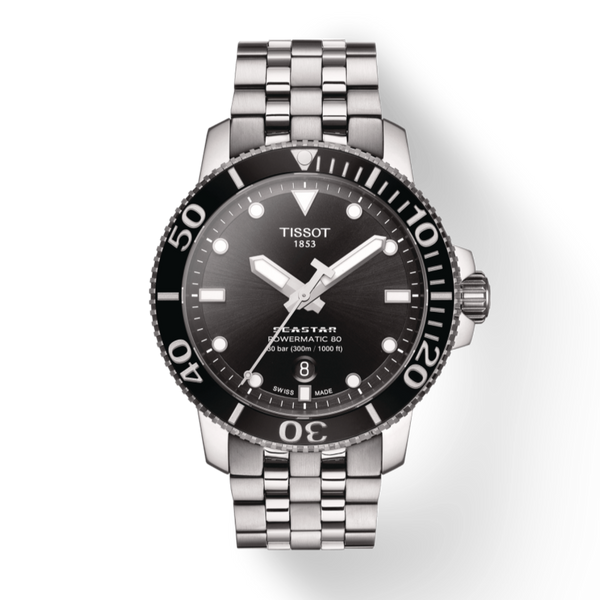 Gents Tissot Seastar 1000 Powermatic 80 Watch. The 43mm case and bracelet are stainless steel with a black ceramic bezel, the dial is black and the glass is sapphire crystal. The watch features a date function. The movement is a powermatic 80. The watch is 300 metres water resistant. Currently out of stock but available to order.