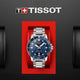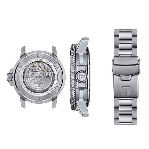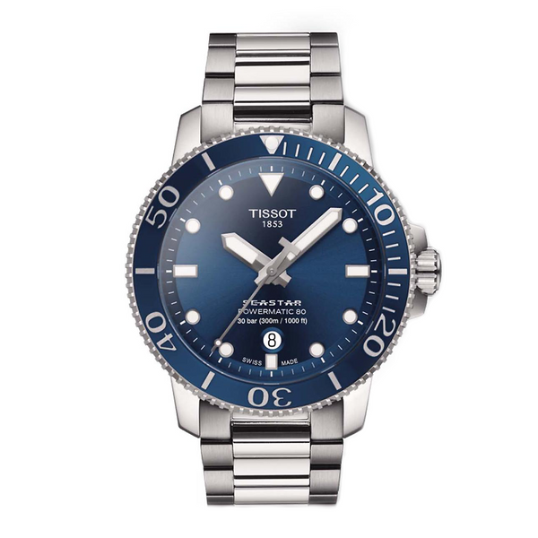 Gent's Tissot T-Sport Seastar 1000 Powermatic 80. The 43mm case and bracelet are stainless steel with a blue ceramic bezel, the dial is blue and the glass is sapphire crystal. The watch has a see-through case back and a date function. The movement is Powermatic 80. The watch is 300 metres water resistant.