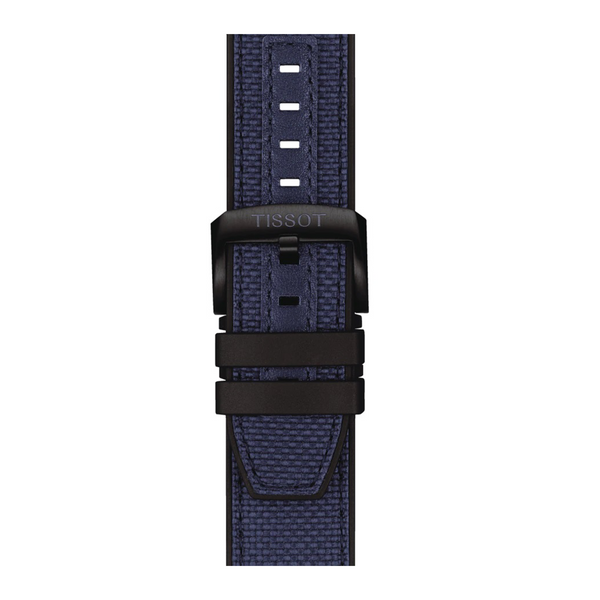 Gent's Tissot T-Sport Seastar 2000 Professional Powermatic 80 Watch. The 46mm case is black PVD on stainless steel. The strap is black rubber with a blue embossed leather front. The bezel is black ceramic, the dial is blue and black with an embossed wave pattern and the glass is sapphire crystal. The watch has a see-through case back, date function, and built in helium escape valve The movement is a powermatic 80 with a Nivachron Balance Spring. The watch is 600 metres water resistant.