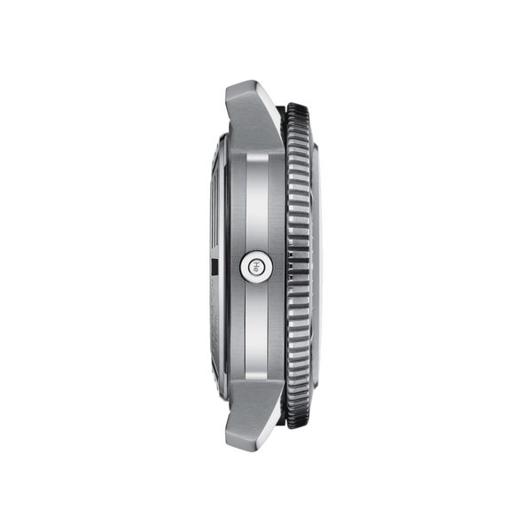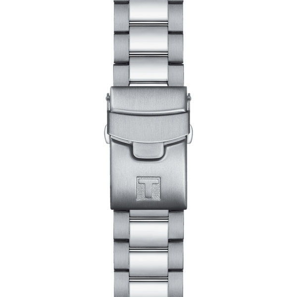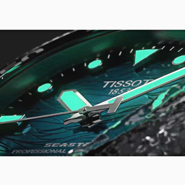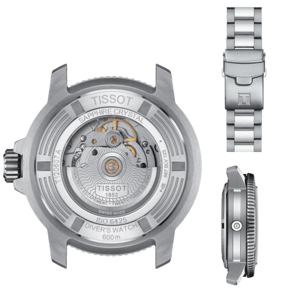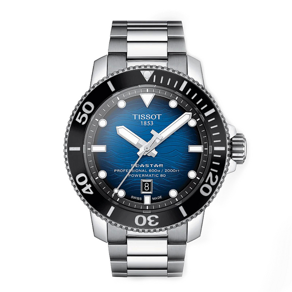Gent's Tissot T-Sport Seastar 2000 Professional Powermatic 80 Watch. The 46mm case and bracelet strap are stainless steel. The bezel is black ceramic, the dial is blue and black with an embossed wave pattern and the glass is sapphire crystal. The watch has a see-through case back and date function. The movement is a powermatic 80 and has a Nivachron Balance Spring. The watch is 600 metres water resistant.