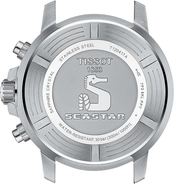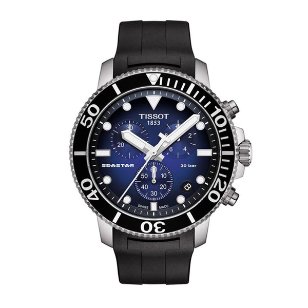 Gent's Tissot T-Sport Seastar Quartz Chronograph Watch. The 45mm case is stainless steel with a black aluminium bezel, the dial is dark blue and the glass is sapphire crystal. The strap is black rubber. The watch features a date function. The movement is quartz. The watch is 300 metres water resistant. Currently out of stock.