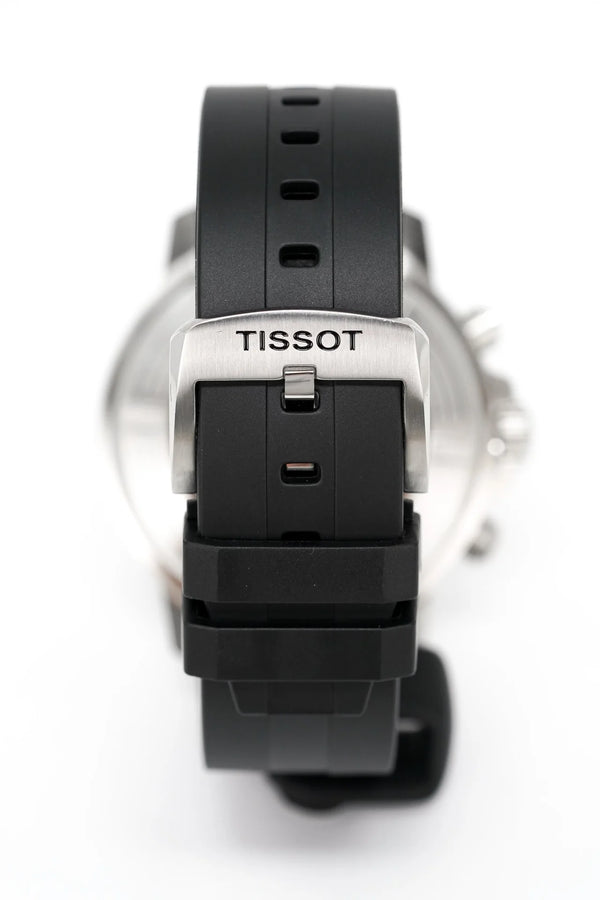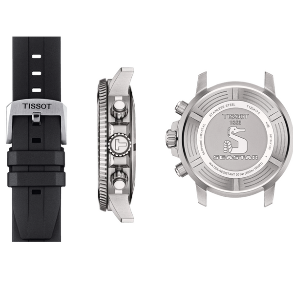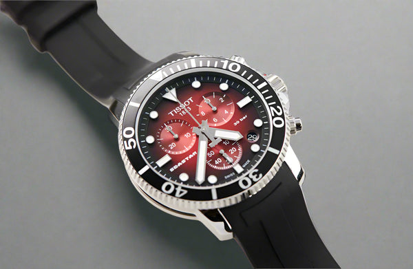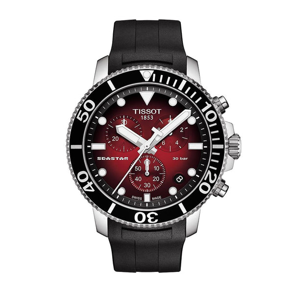 Gent's Tissot T-Sport Seastar 1000 Chronograph Quartz Watch. The 45.5mm case is stainless steel with a black rubber strap and black aluminium bezel. The dial is red and black with three sub-dials and a date function. The glass is sapphire crystal and the watch is 300 metres water resistant. The movement is quartz.