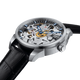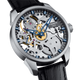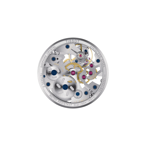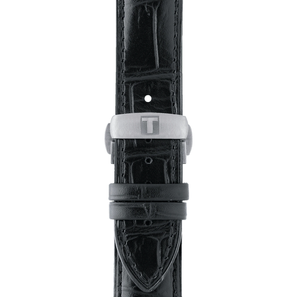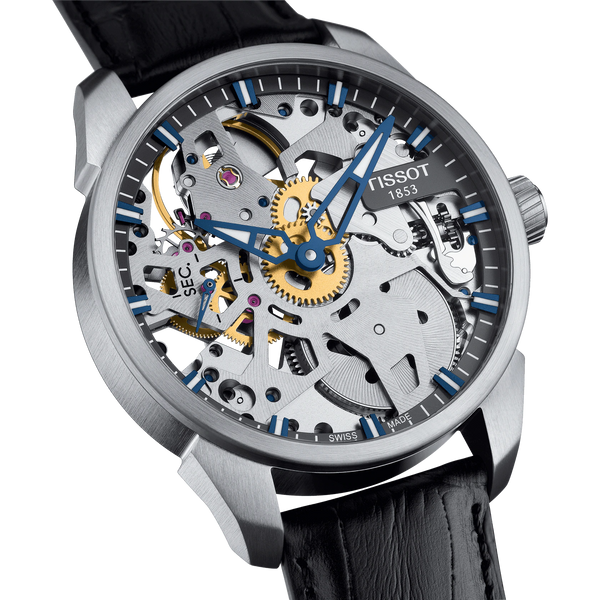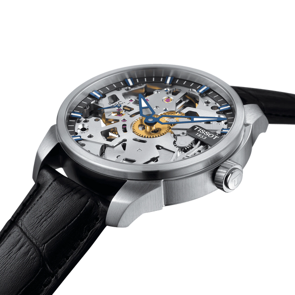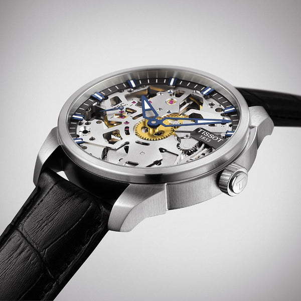 Gent's Tissot T-Complication Squelette Mechanical Watch. The 43mm case is stainless steel with a black leather strap and deployment clasp. The watch features a skeleton dial and see-through case back revealing the mechanical movement. The glass is a domed sapphire crystal. The movement is manual wind.