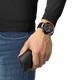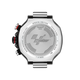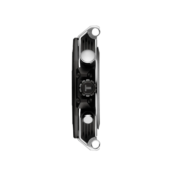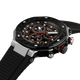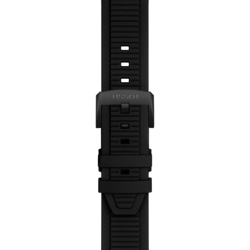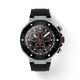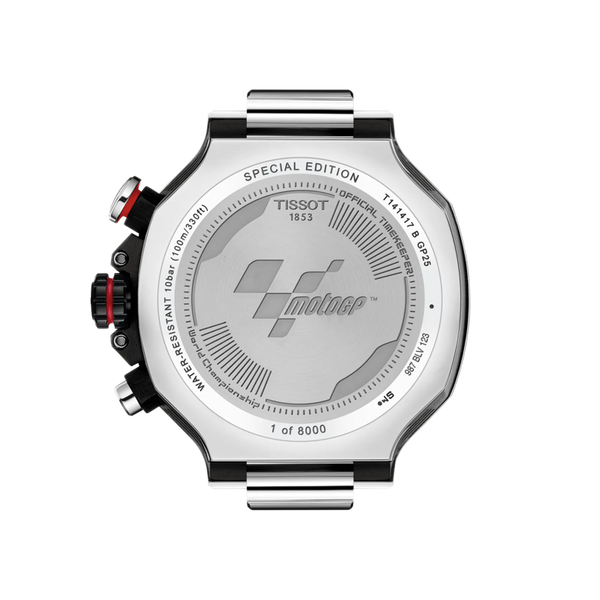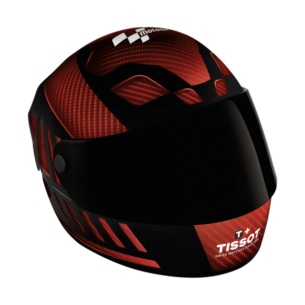Gent's Tissot T-Race MotoGP (2025) Quartz Chronograph Limited Edition Watch. The 45mm case and brake disc style bezel are stainless steel with black PVD coating with black silicon strap. The watch has a dark grey dial with red accents, a tachymeter scale on the inner rim and three sub-dials. The case back has MotoGP engraving and the glass is sapphire crystal. The movement is quartz. Presented in a special helmet-shaped box. One of 8,000 pieces worldwide.
