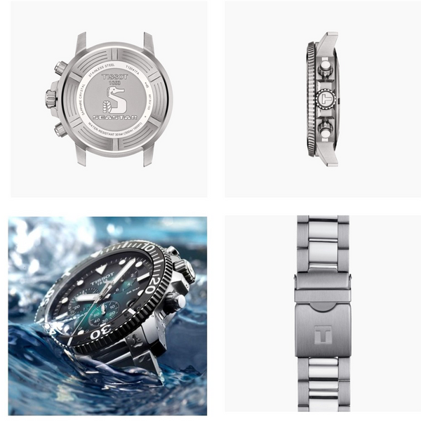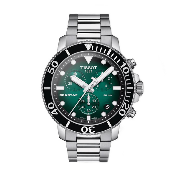 Tissot T-Sport Seastar Quartz Chronograph Watch. The 45.5mm case and bracelet are stainless steel with a black bezel, the dial is black and green and the glass is sapphire crystal. The watch has a date function and is 300 metres water resistant. The movement is quartz. Currently out of stock but a new piece is expected to arrive instore soon.