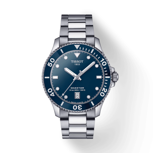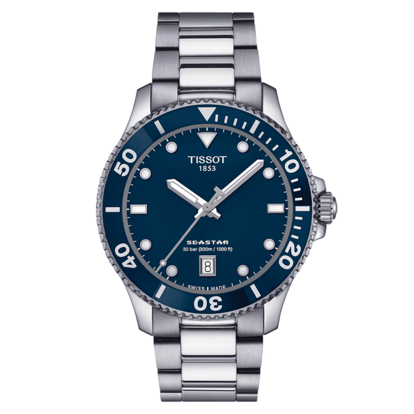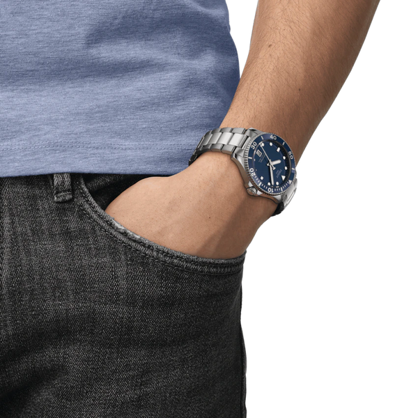 Gent's Tissot T-Sport Seastar 1000 Stainless Steel 40mm Case and Bracelet Blue Bezel Blue Dial Sapphire Crystal Glass Date 300m Water Resistant Quartz Watch.