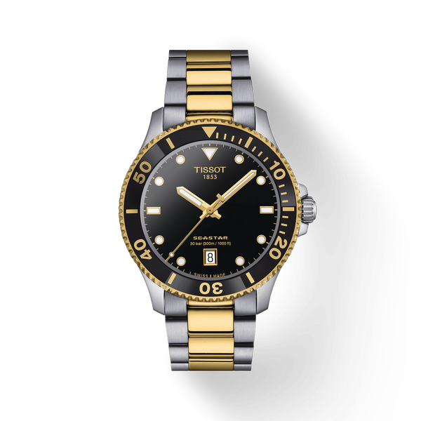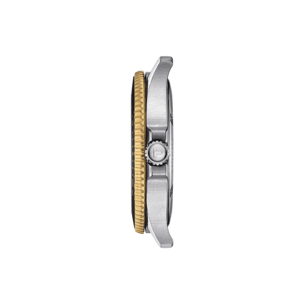 Gent's Tissot T- Sport Seastar 1000 Bicolour: Yellow Gold PVD and Stainless Steel 40mm Case and Bracelet Bicolour Black with Yellow Gold PVD Edge Bezel Black Dial Date 300m Water Resistant Quartz Watch.