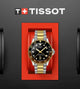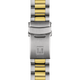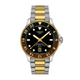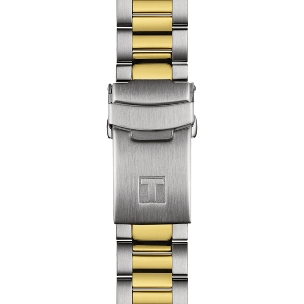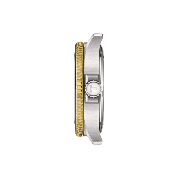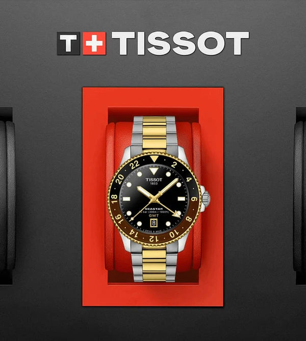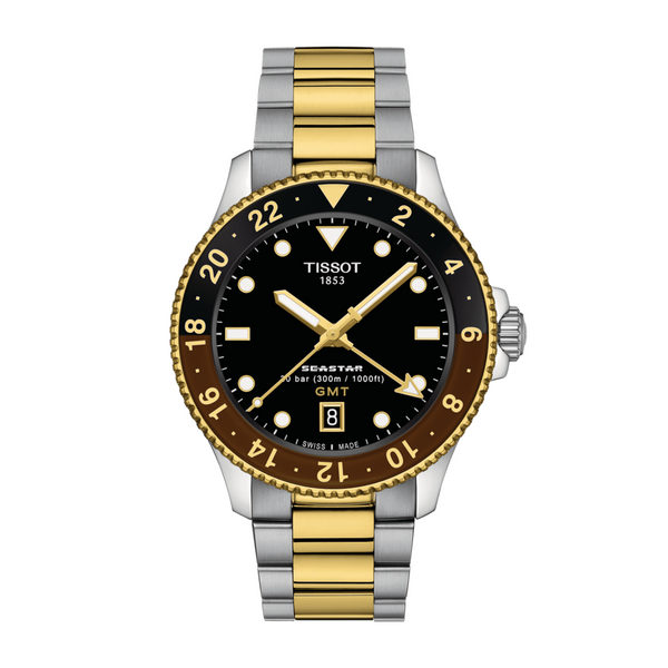 Gent's Tissot T-Sport Seastar 1000 GMT Quartz Watch. The 40mm case and bracelet are bicolour: yellow gold PVD and stainless steel. The yellow gold PVD mineral bezel is black and brown. The dial is black and has a date function and GMT hand. The glass is sapphire crystal. The watch is 300 metres water resistant. The movement is quartz.