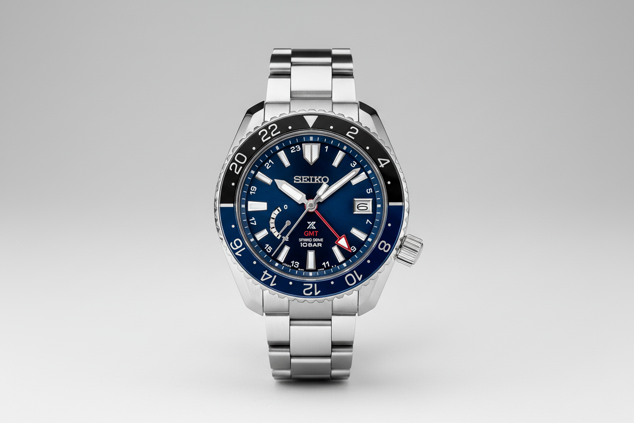 Gents Seiko Prospex LX GMT Spring Drive Watch. The 44mm case and bracelet are titanium, the dial is blue, and the glass is sapphire crystal. The watch features GMT and date functions and has a power reserve indicator. The bezel is blue and black in colour. The watch is 100m water resistant. The movement is a spring drive (powered by the wearer). Three year Seiko international warranty.  Currently out of stock.