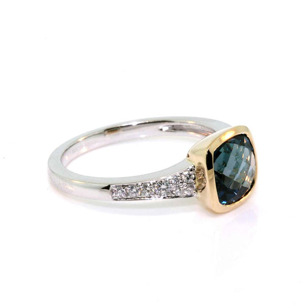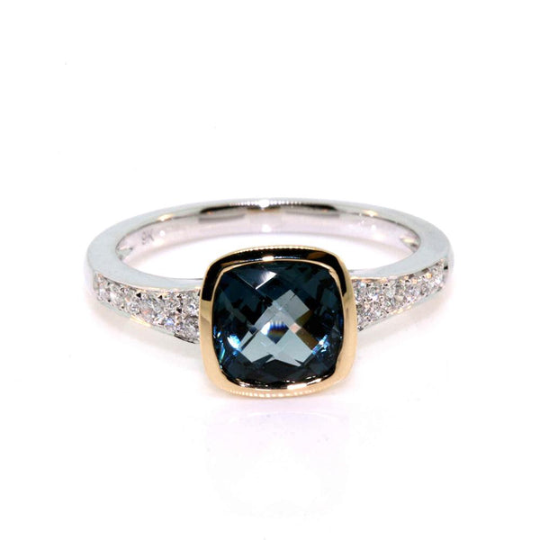 9k yellow and white gold dress ring set with a 1.69ct cushion cut london blue topaz and 0.16cts of round brilliant cut diamonds, quality H / SI.