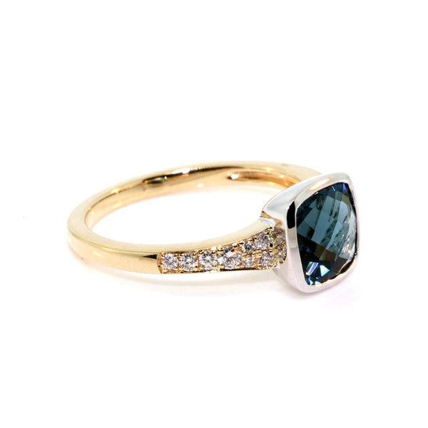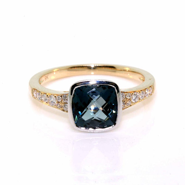 9k yellow and white gold dress ring set with a 1.7ct cushion cut london blue topaz and 0.16cts of round brilliant cut diamonds, quality GH / SI.