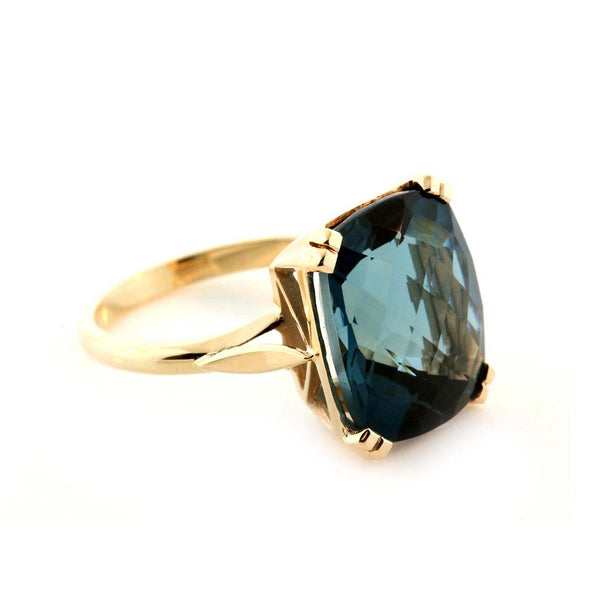 9k yellow gold dress ring set with an 8ct cushion cut London blue topaz.