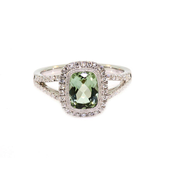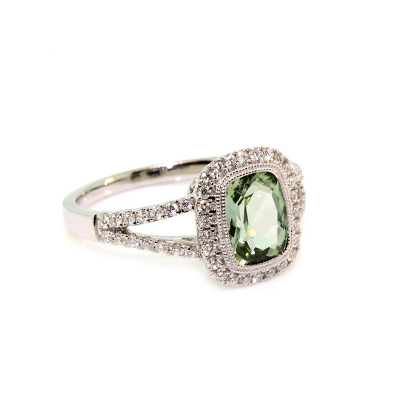 18k White Gold Green Tourmaline and Diamond Ring. This ring is set with a 1.60ct cushion cut mint green Tourmaline measuring 8 x 6mm and 0.38cts of round brilliant cut diamonds, GH colour and SI clarity. This design is made to order in the required finger size.