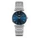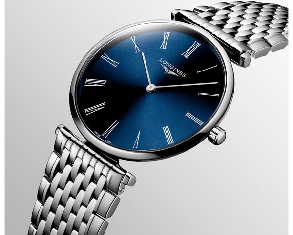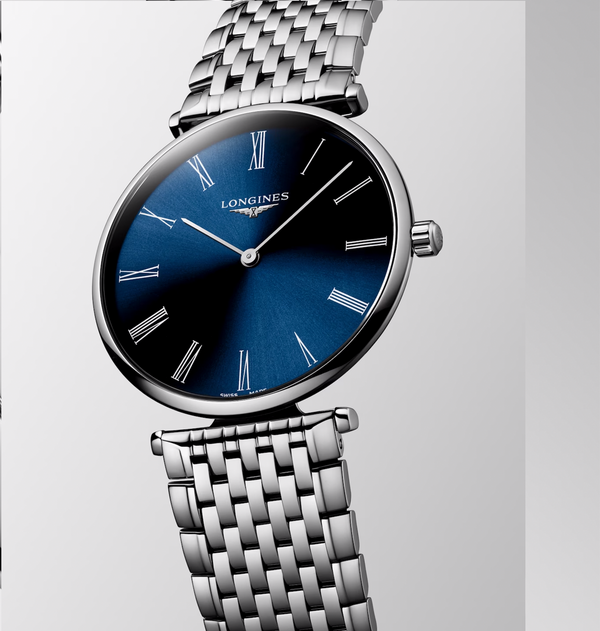 Longines La Grande Classique Quartz Watch. The 38mm case and bracelet are stainless steel. The dial is blue and the glass is sapphire crystal. The movement is quartz.