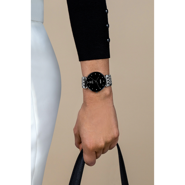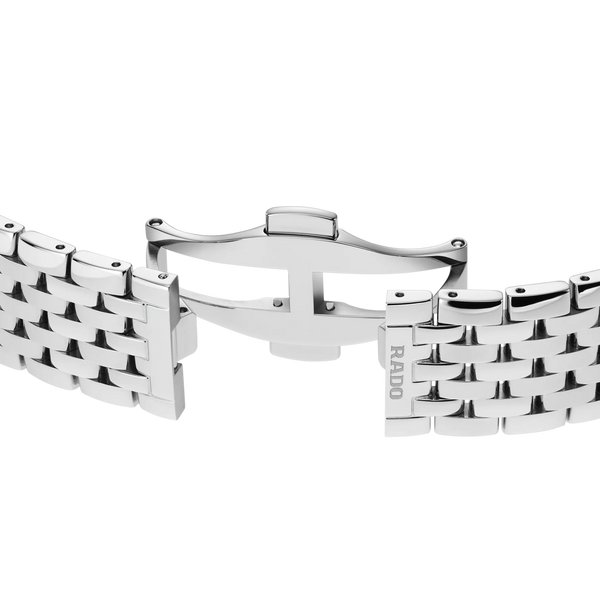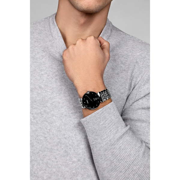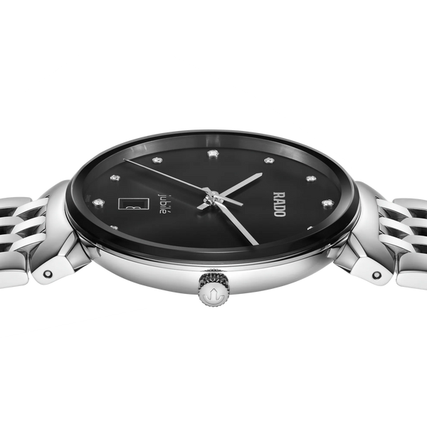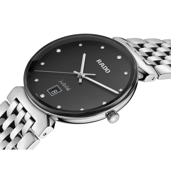 Rado Florence Classic Quartz Watch. The 38mm case and bracelet are stainless steel. The dial is black with twelve diamond hour markers and a date function. The glass is sapphire crystal. The movement is quartz. Currently out of stock.