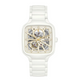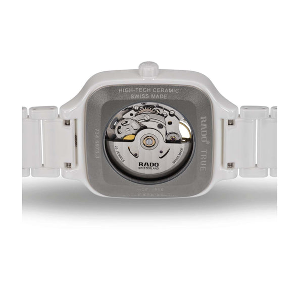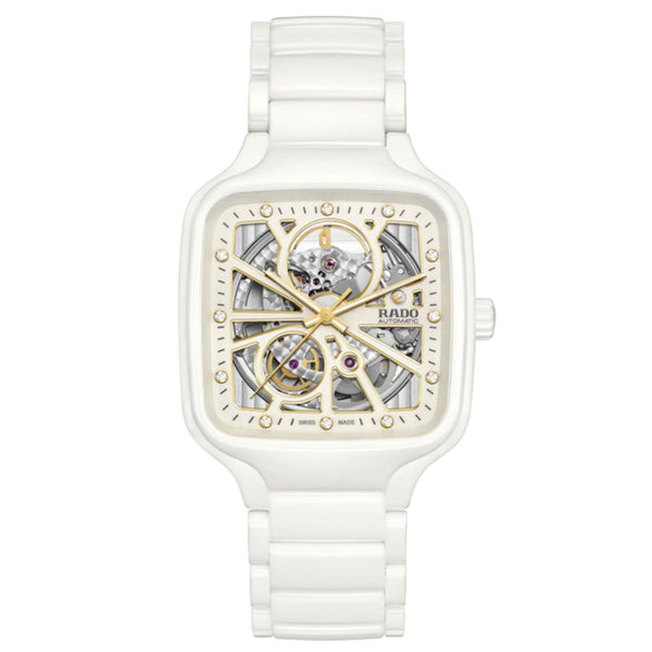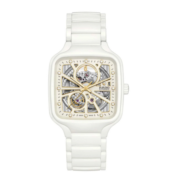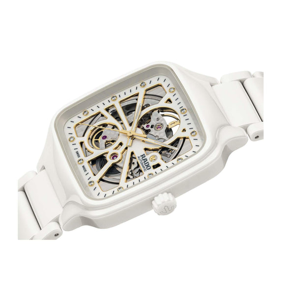 Rado True Square Open Heart Automatic Watch. The 38mm square shaped case and bracelet are white high tech ceramic. The watch features a white skeleton dial revealing the movement and has 12 diamond set hour markers. The glass is sapphire crystal and the movement is automatic. Currently out of stock but available to order.