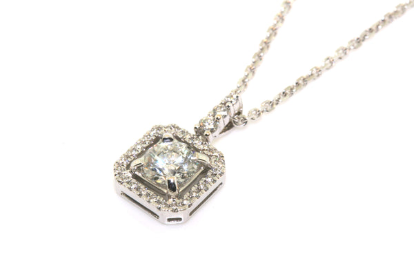 18k white gold diamond halo pendant set with a 0.50ct round brilliant cut centre diamond, F colour SI3 clarity, very good make. The halo is set with 0.18cts of round brilliant cut diamonds, GH colour and SI1-2 clarity. The pendant comes with a 9k white gold Italian curb link pendant chain, 45cm in length. Currently out of stock but available to order.