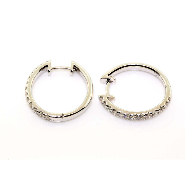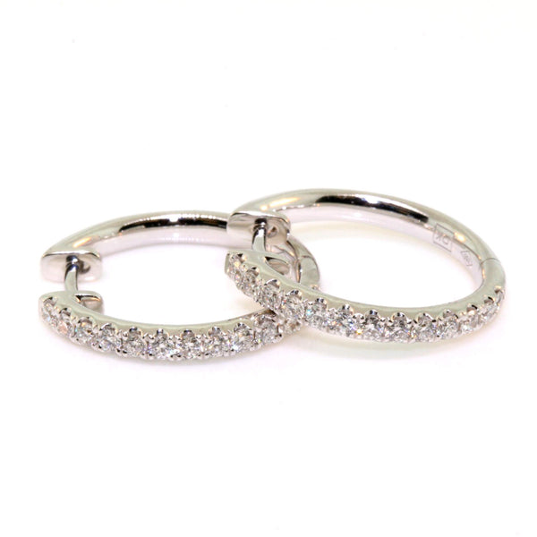 18k white gold diamond hoop earrings, set with 0.58cts of round brilliant cut diamonds, GH colour, SI clarity. The earrings are hinged and oval in shape. Currently out of stock.