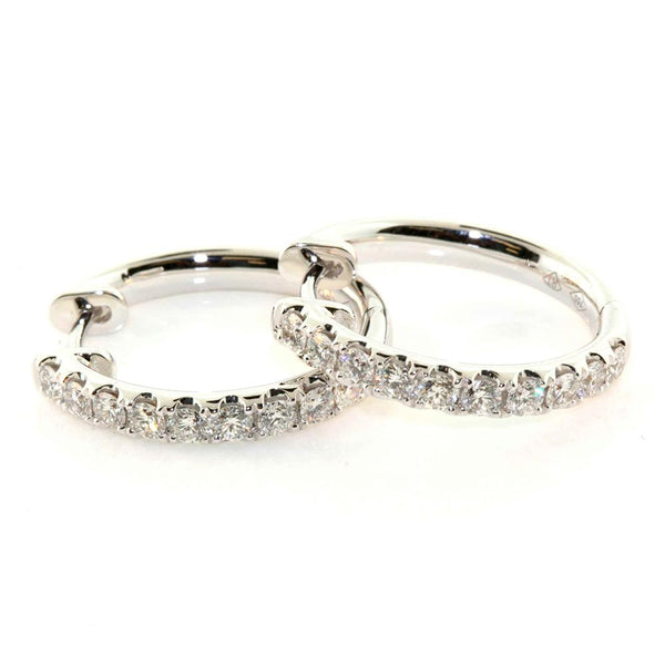 18k white gold diamond set hoop earrings. The earrings are set with 0.80cts of round brilliant cut diamonds, colour GH, clarity SI. The earrings are hinged with ten diamonds set into the front of each hoop.
