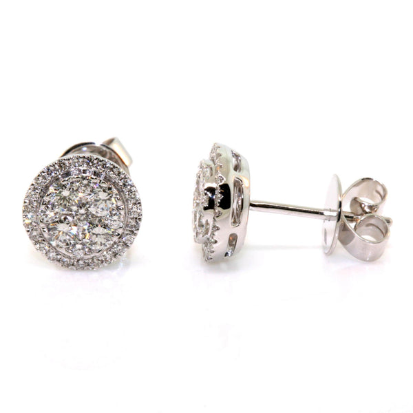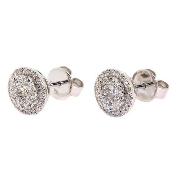 18k white gold diamond halo stud earrings set with 0.80cts of round brilliant cut diamonds, GH colour, SI1-2 clarity.