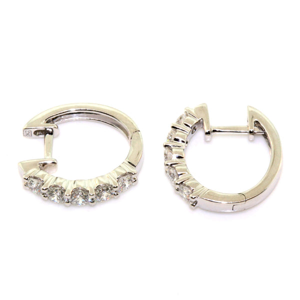 18k white gold diamond hinged hoop earrings set with 0.88cts of round brilliant cut diamonds, FG colour, VS-SI clarity. Currently out of stock.