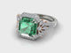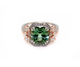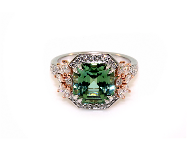 Custom-made 18k rose and white gold tourmaline and diamond dress ring. The ring is set with a 5.27ct emerald cut mint green tourmaline, and 0.75cts of marquise cut and round brilliant cut diamonds, FG colour, VS-SI clarity.