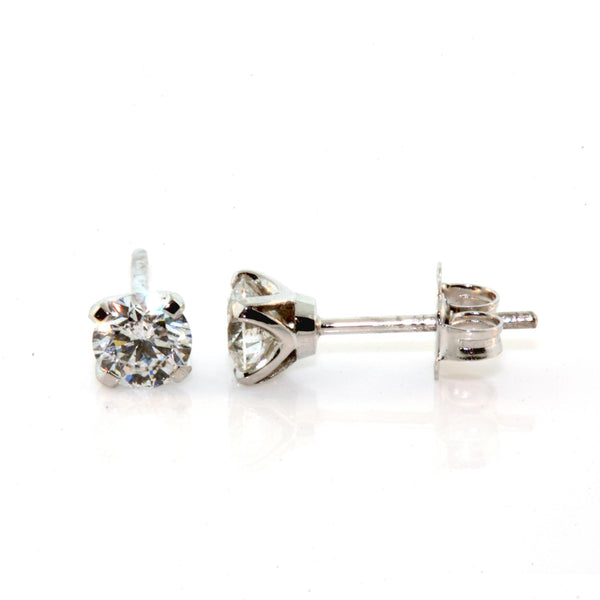 18k white gold four claw diamond stud earrings. The earrings are set with 2 = 1.0ct in total round brilliant cut diamonds, H/SI2, triple excellent cut, GIA certified. Currently out of stock but available to order.