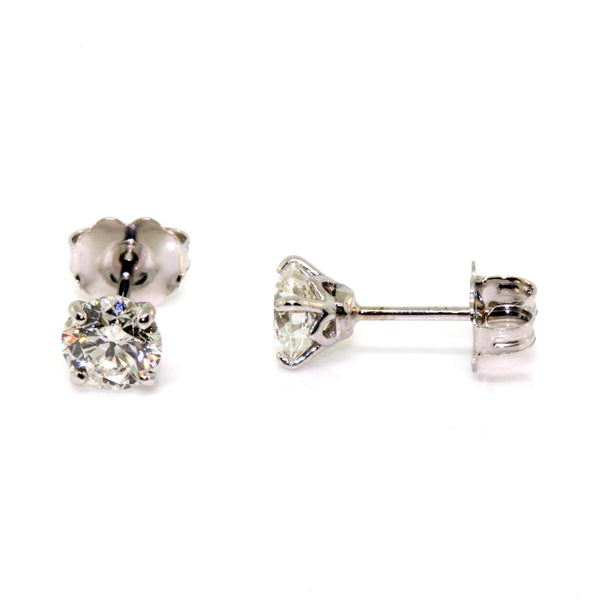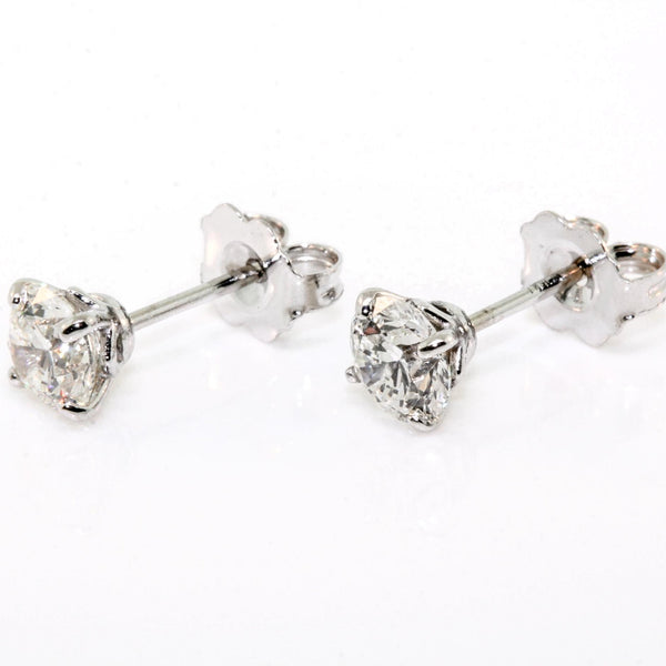 14k white gold four claw diamond stud earrings. The earrings are set with 2 = 1.07cts in total of round brilliant cut diamonds, H / I1, triple excellent cut, GIA certified.