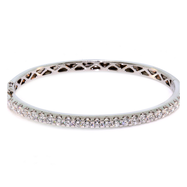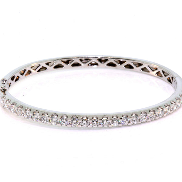 18k white gold hinged diamond bangle, set with 3.2cts of round brilliant cut diamonds, quality FG colour and SI clarity. The bangle is made to order in the required wrist size.