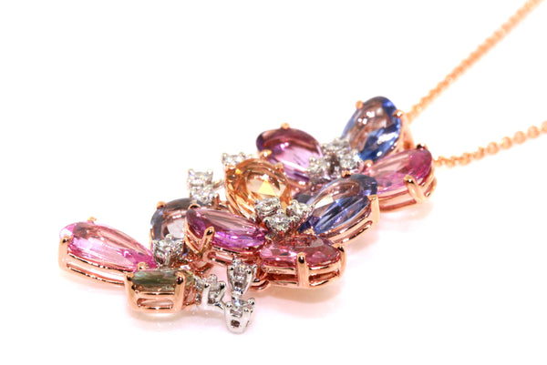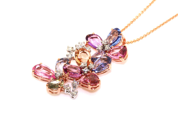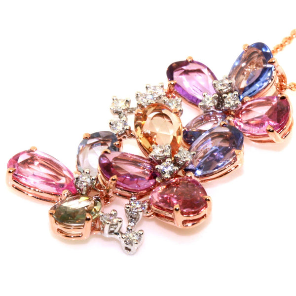 18k Rose and White Gold Sapphire and Diamond Flower Pendant. The pendant is set with 6.25cts of mixed shape and colour sapphires and 0.07cts of round brilliant cut diamonds, GH colour, VS-SI clarity.