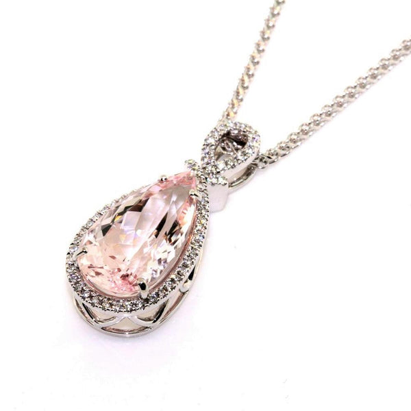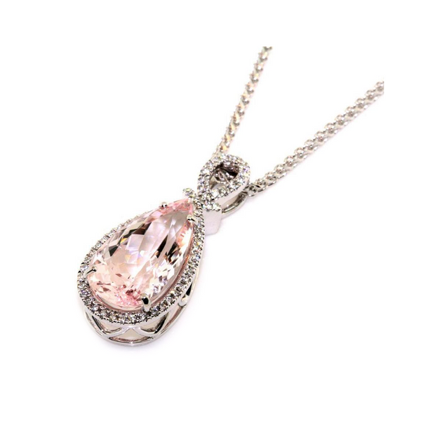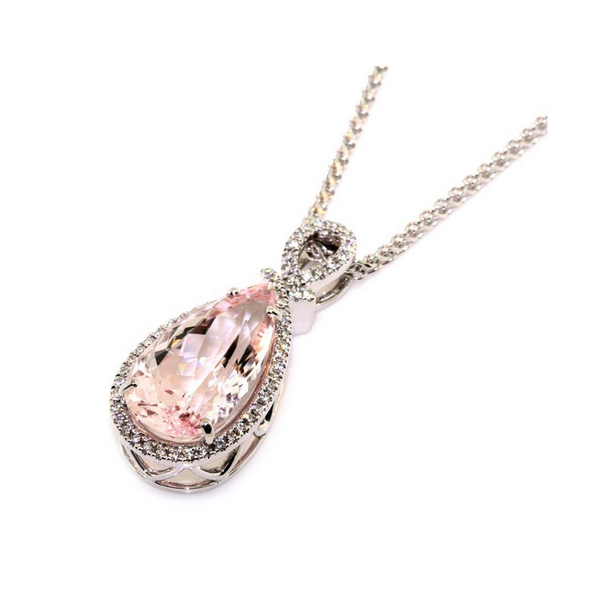 18k white gold halo pendant set with a 7.26ct pink Tanzanian morganite, and 0.35cts of round brilliant cut diamonds, quality GH / SI. The pendant comes with a 9k white gold Italian 1.5mm foxtail chain, 45cm in length.